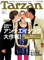 ・Features 30歳から始める アンチエイジング大作戦! ■ 暦年齢と異なる第2の年齢、バイオロジカルエイジとは? ■ 6つの基本原則を把握して人生の宴を死ぬまで楽しめ! ■ 5歳若く見せるために ■ 男だって見た目で勝負! 今日からできる髪&肌ケア法。 ■ 女も肌&髪を正しくケアして、エイジレスな外見を手に入れる! ■ 5歳若い見た目はまず姿勢から。アナタはちゃんと立てているか? ■ 10歳若いカラダの作り方 ■ コンビネーショントレーニングで、運動神経を刺激、脳の老化を防ぐ。 ■ ストレッチで柔軟性を高め、姿勢を正して若いカラダを保つ! ■ 日常の悪い習慣で歪んだ骨格を、ストレッチでリセットしよう。 ■ 複合筋トレで全身をまとめて鍛え、筋肉だけでなく骨や関節も若返る! ■ 加圧トレーニングは威力抜群、老化防止だけでなく血流も改善する! ■ もっとも老化しやすい下半身は、階段や坂道で効率よく鍛錬しよう。 ■ 20年後もカッコよく元気でいるために ■ カラダの内側から考える、「食べる」アンチエイジング法。 ■ 手軽に鍛えてリフレッシュ、若さを保つ「脳トレ」のススメ。 ■ アンチエイジングの強い味方、サプリメントで加齢対策を! ■ 30代から気をつけたいヤバい病気の最新事情。 ■ 若いカラダを保つために、こんな禁煙の方法がある。 ■ メタボは年をとるごとに損、健康の経済学入門! 〈第2特集〉 2007 Tarzan 冬のクルマ学 冬こそ4駆、今こそAWD。 〈特別レポート〉 F1グランプリ2007 波乱万丈の今シーズンを総括! 〈Book in Book〉 WELCOME TO NEW RUNNING WORLD ・Regulars ・TARZAN of the Month: 奥田民生に注目! ・TARZAN EXPRESS: 伝説の〈YASUDA〉や≪エア パイソン≫が復活…etc. ・On The Road: TOYOTA VANGUARD ・筋肉おやじ&アブラミくん: 「ハゲは老けて見える」「やせたらシワシワ」 ・Cinema: popcorn&coke『モーテル』 ・Music: 真心ブラザーズ インタビュー ・Book: 『草野球をとことん楽しむ』降籏学 インタビュー ・ハッピー☆ボディメイク占い: 村上さなえ先生があなたの運勢を占います。 ・ENGLISH TO WIN!: お料理編。 ・MUSCLE & Me: トレーナーにカラダを触られて、すごい筋肉だと言われました。(加藤歩/ザブングル) ・APE CALL!: 運動嫌いが大変身。いつかはフルマラソンに…他3本。 ・いざっ! カマ・ク・ラ: カヌー家族にトンプソン…、ん? ・H・テラサキの「自走式」: 実篤の南瓜を想い深大寺蕎麦。 ・The Love of Running: 千葉真子 インタビュー ・In The News: 私がマラソンを通じて、伝えたい想いとは…etc. ・Jungle Talk: アンゲラ・アイター(プロフリークライマー) ・Trail-run KING: NZフィヨルドを行く。 ・環境力調査隊: ユーラシア大陸を流れる川のpHを測ってきた! ・Kitchen Tarzan: あつあつゴマ油の風味で食す、極上タコレシピ。 ・Lookin' Good: 髪型を自在に操るヘアワックス。 ・Powder Room: 冬のお出かけ、"ハレ"の日にはキモノで。 ・Look at This!: 地上最強のサバイバルウェアから生まれた防水服。 ・Buy or Die!: いちばんのモダンに、いっぱいの落書きを許す。 ・Mechatronics Tarzan: あふれ出しそうなパソコンのデータを救え! ・Performance BEST: キリン発泡酒≪淡麗アルファ≫ ・Locker Room: 愛は○○○○の○○○よ! 本当よ、の巻。 ・Jane's fit: ケリー(モデル) ・カトリーヌが観た。2&次号予告: 大みそかの格闘技番組は、ガチンコもいいけど笑いもね。 | |||||||||||||||||||||||||||||||||||